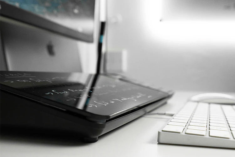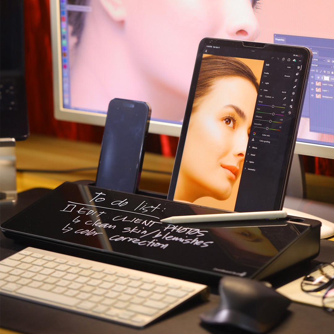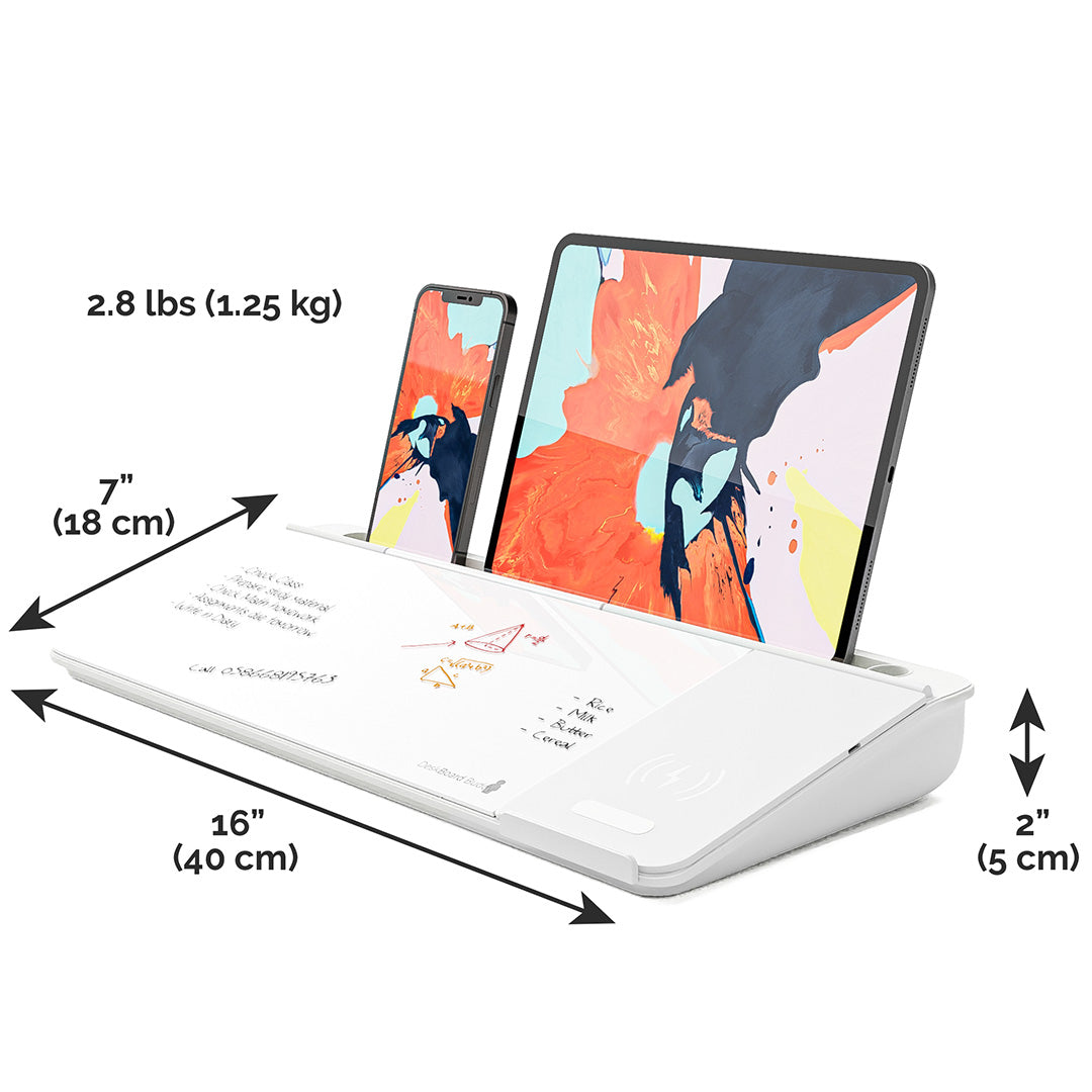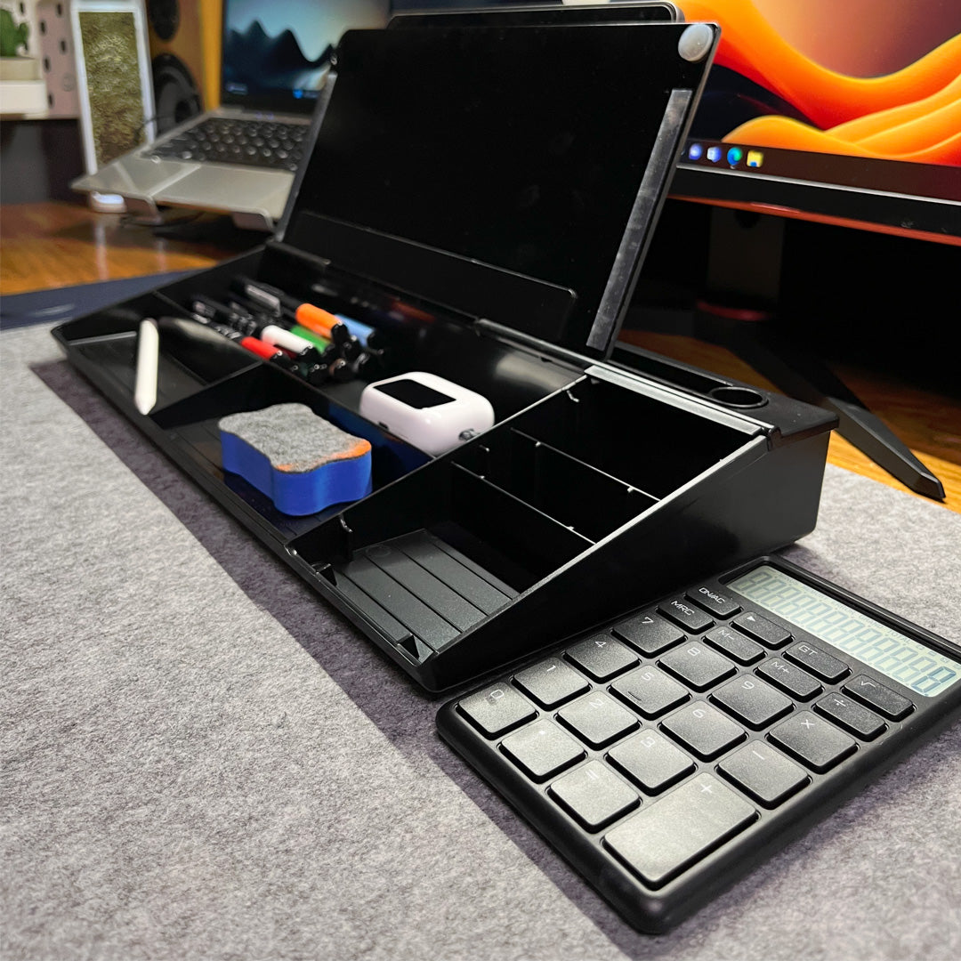 Introducing the ultimate upgrade for your workspace — the DeskBoard Buddy® Desktop Whiteboard with built-in storage and a phone stand. Featuring a sleek glass writing surface for effortless jotting and erasing, it keeps your desk organized and your ideas clear. Lift the glass to reveal a spacious hidden storage compartment for markers, pens, and other essentials, while the integrated phone stand keeps notifications in sight. Available in white or black, and optional add-ons include a side-mounted calculator or wireless charger for maximum productivity and convenience.