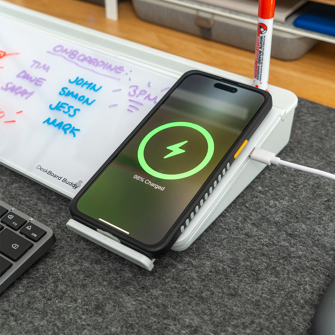 Want to charge your phone while you work? Add this wireless charger to your DeskBoard Buddy! Fit's any phone size from 5.5-7.5" thanks to it's adjustable foot-stand. Includes matching color 5 ft USB C to USB C cable in the box.